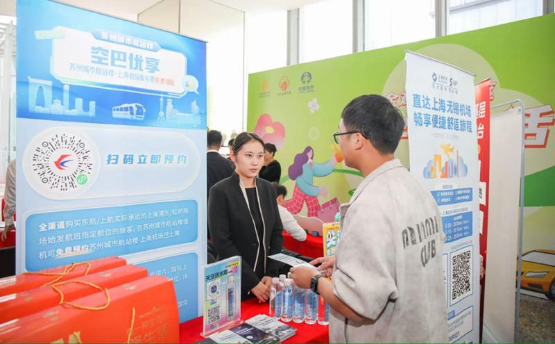 “從城市航站樓出發,多久可以到達上海浦東機場?”“最早的班車幾點出發?”在蘇州城市航站樓的展位前,工作人員耐心解答員工關于出行服務的疑問,從航班信息查詢到行李托運服務,為員工提供了全方位的出行指導。