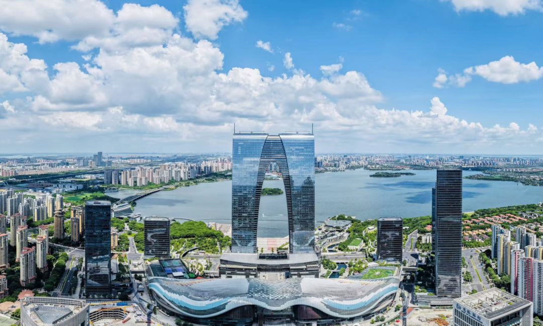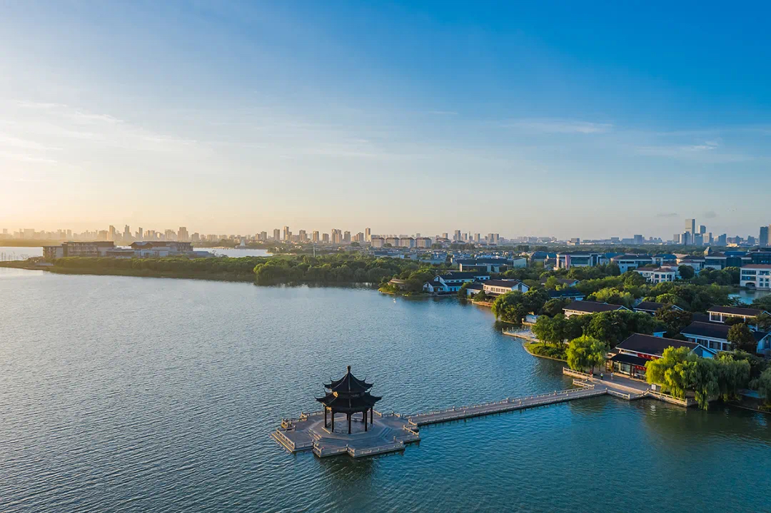 蘇州工業園區河道縱橫、水網密布,金雞湖及周邊區域水清岸美、城水相依,勾勒出了一幅“人水和諧”的生態畫卷。