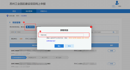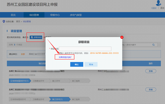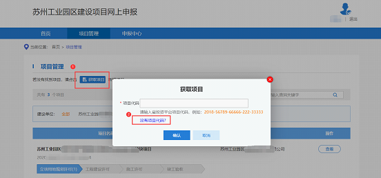 1.2.2. 如果本單位的項目(新拿地、已有地新建等有發(fā)改項目代碼的項目)未展示出來,則點擊“獲取項目按鈕”,在項目代碼欄輸入項目代碼獲取項目,點擊“確認”按鈕獲取。