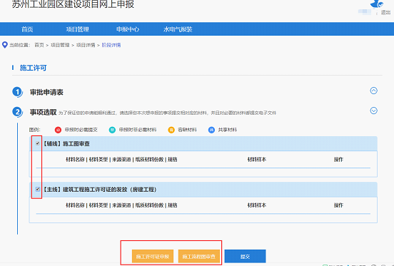 勾選所需辦理的事項前面的復選框,如果所需辦理事項涉及到施工許可證和施工圖審查,則下方會出現(xiàn)兩個黃色的“施工許可證申報”“施工圖審查申報”按鈕,點擊按鈕會分別跳轉到對應的平臺辦理對應的業(yè)務,其他無需跳轉辦理的辦件,仍在工程建設項目網(wǎng)上申報平臺上傳材料。跳轉提交所需的施工圖審查和施工許可證材料之后,必須在工程建設網(wǎng)上申報平臺點擊藍色的“提交”按鈕,才能提交工改審批端審批,并且點擊“提交”按鈕才會給施工許可和施工圖審查系統(tǒng)發(fā)送待辦提醒。