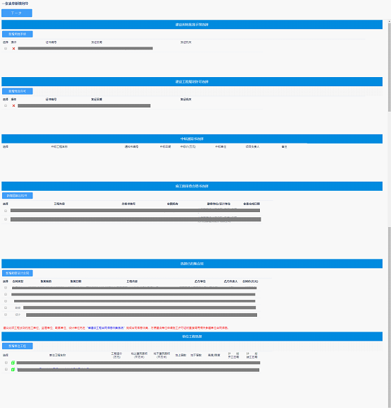 上述內(nèi)容選擇完成以后點擊“下一步”,系統(tǒng)將根據(jù)選擇的內(nèi)容自動抓取相關數(shù)據(jù)和文件,生成施工許可申請數(shù)據(jù),并進入一張表單數(shù)據(jù)整理操作界面等待完善和補足。