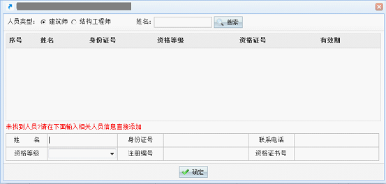 若未找到設計單位人員信息可在圖注5-3窗口添加相關人員信息,施工或監(jiān)理單位人員需從列表中選不可添加。