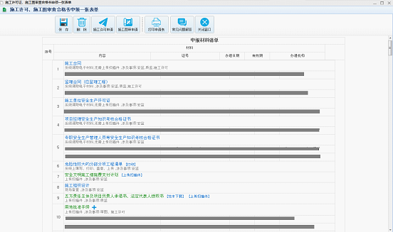 如圖3.8所示,為一張表單數(shù)據(jù)整理和資料準備窗口,在這里可以完成安全報監(jiān)、質(zhì)量報監(jiān)、施工許可申報表的信息補充和資料的上傳。