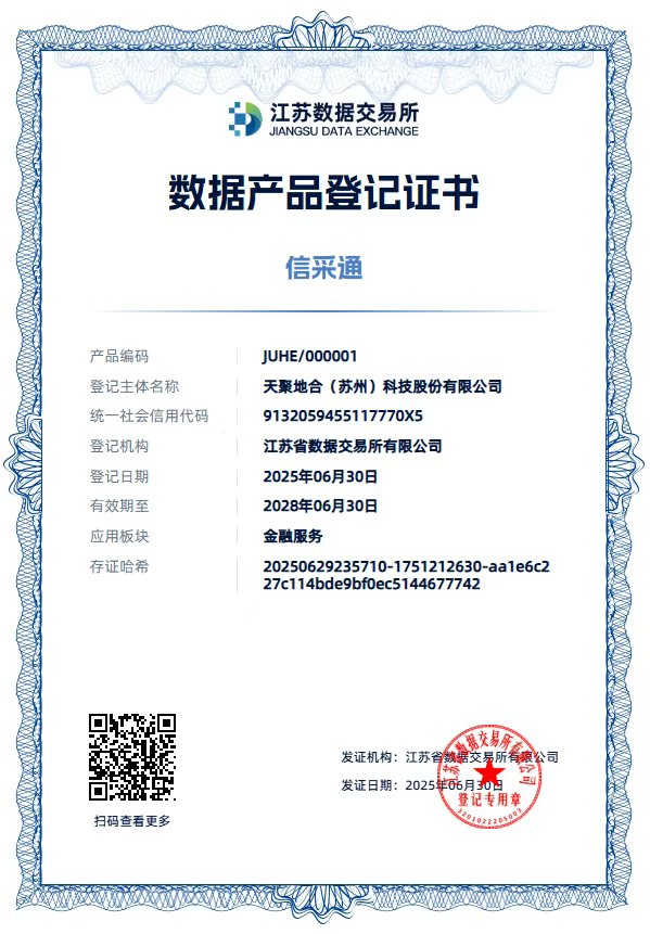 作為江蘇省級公共數據授權運營首批核心開發主體,天聚地合提供的權威個人及企業信用維度數據服務,彰顯了公司在推動公共數據要素市場化流通中的技術實力與責任擔當。該產品致力于優化金融機構個人信用評估模型,提升風險識別精準度與效率;賦能企業資質智能核驗與多維度風險動態評估,助力金融機構及商業伙伴高效識別優質企業,動態監控經營風險。