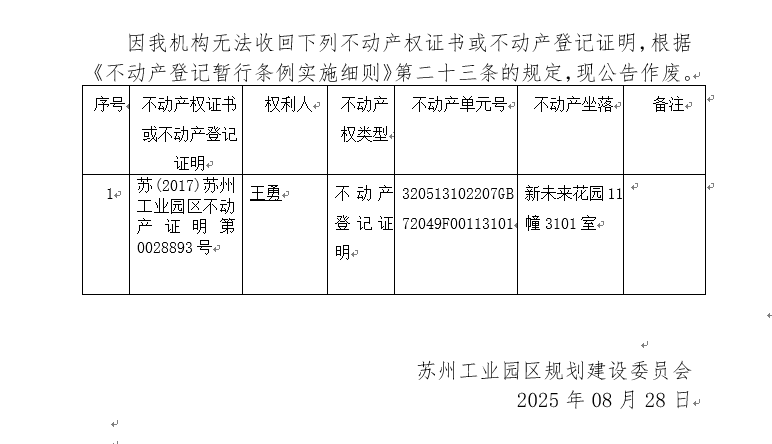 不動產權證書/登記證明作廢公告蘇園 證廢字2025(0135)號(新未來花園11幢3101室)