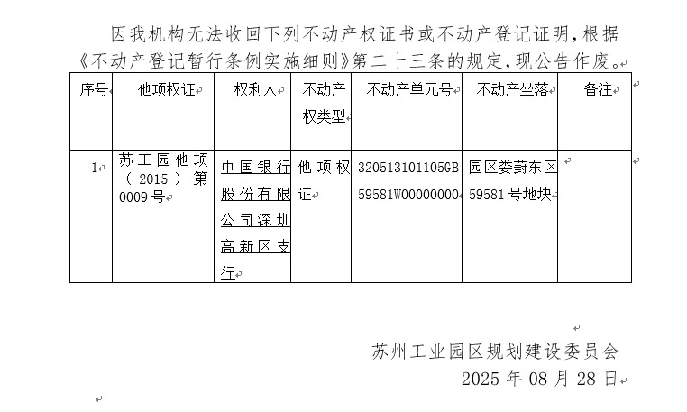 不動產權證書/登記證明作廢公告蘇園 證廢字2025(0136)號(園區婁葑東區59581號地塊)