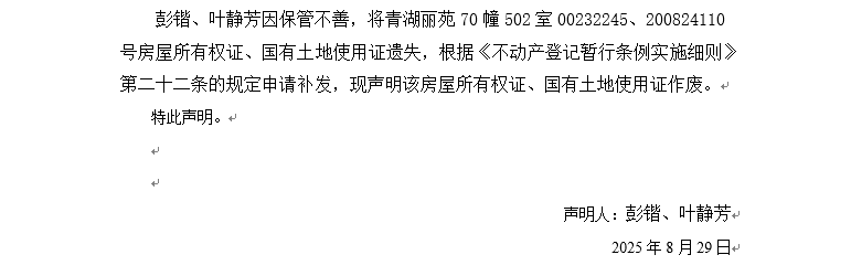 關(guān)于青湖麗苑70幢502室00232245、200824110號(hào)房屋所有權(quán)證、國(guó)有土地使用證遺失聲明