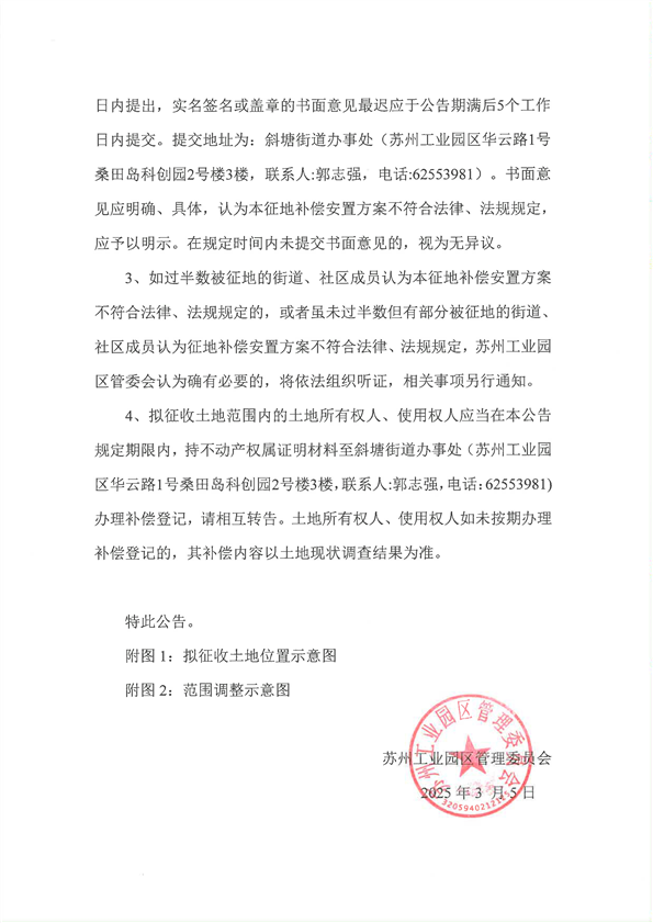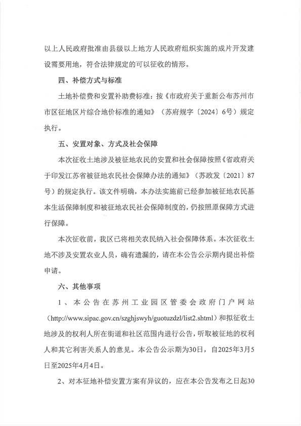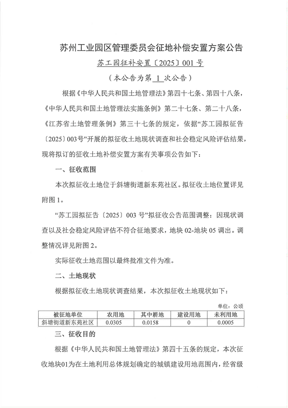 蘇州工業園區2025年度第5批次城市建設用地--蘇州工業園區管理委員會征地補償安置方案公告(蘇工園征補安置〔2025〕001號)