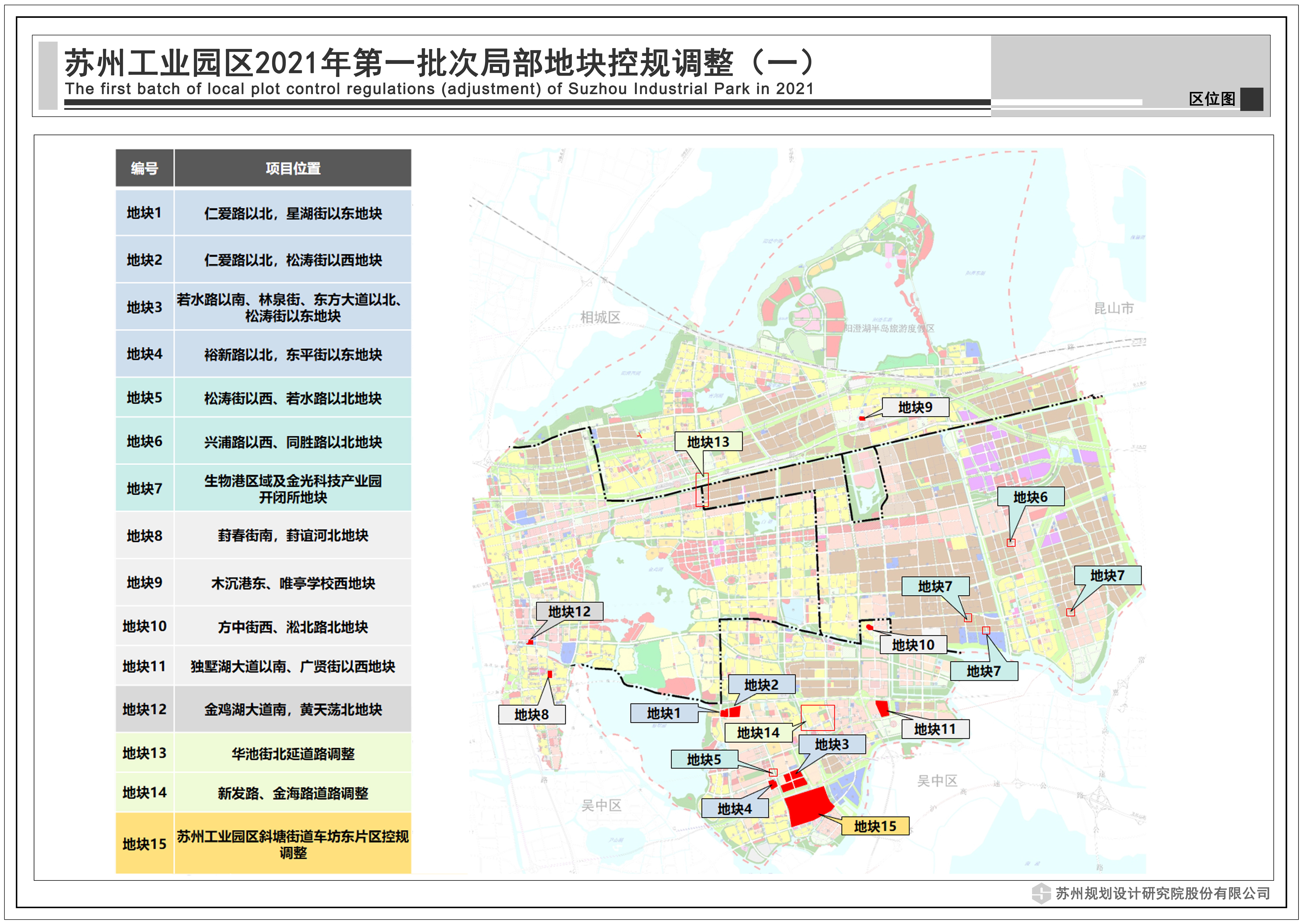 蘇州工業園區2021年第一批次局部地塊控規調整(一):共包括15個地塊,總用地面積約2.18平方公里,詳見附圖區位圖。