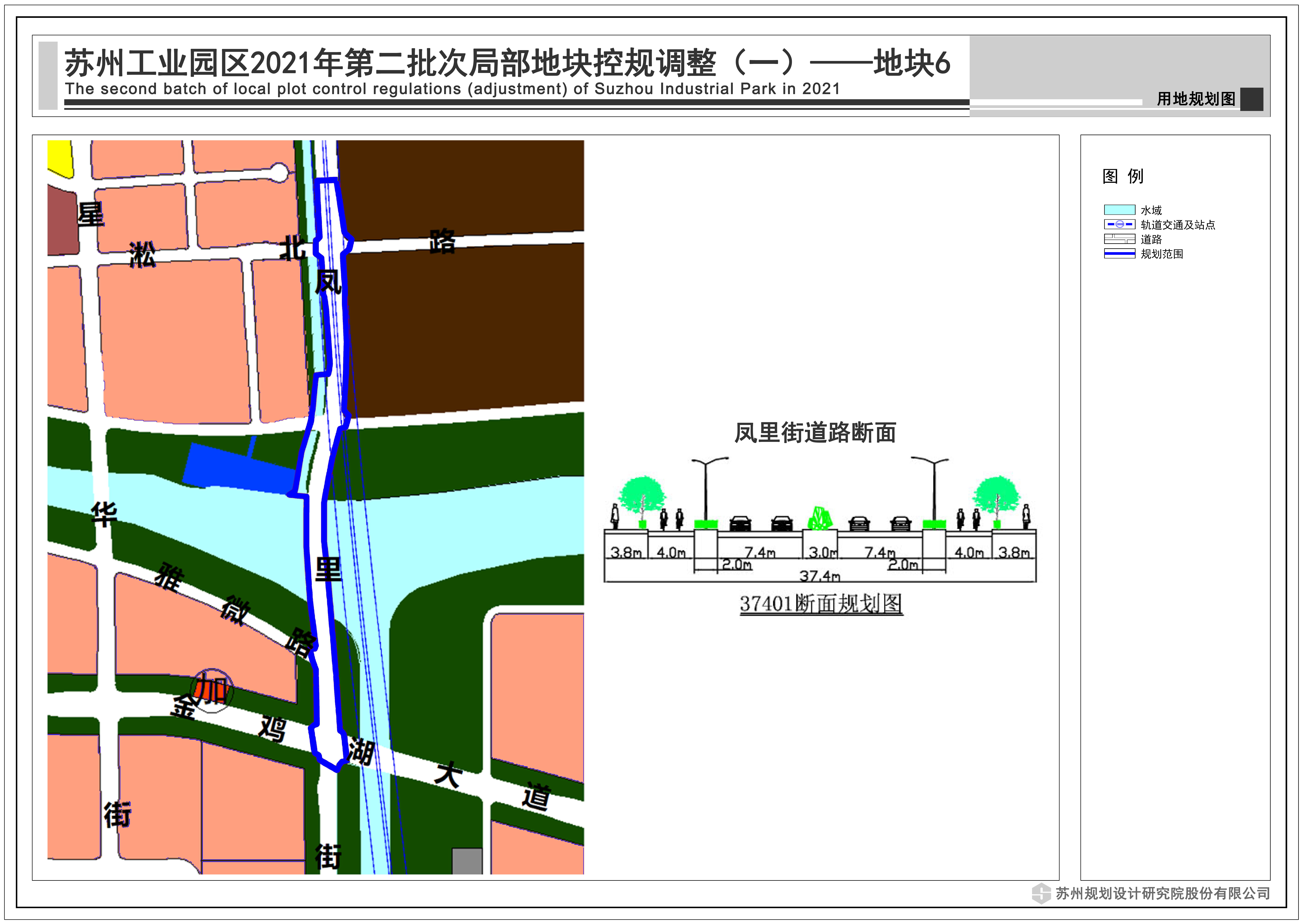 為進一步優(yōu)化與通蘇嘉甬高鐵線等的關(guān)系,調(diào)整鳳里街南延線型,道路斷面采用37.4米標(biāo)準(zhǔn)斷面,雙向四車道;同時調(diào)整道路西側(cè)鳳里浦河道線型。