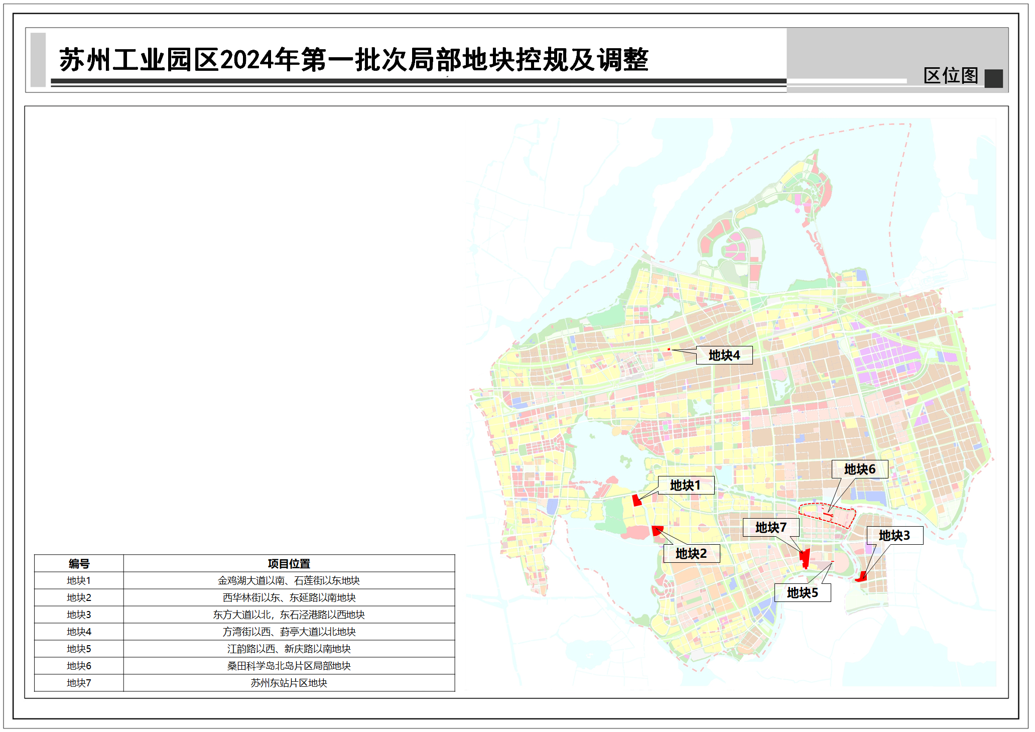 蘇州工業園區2024年第一批次局部地塊控規調整:共包括7個地塊,總用地面積約0.69平方公里,詳見附圖區位圖。