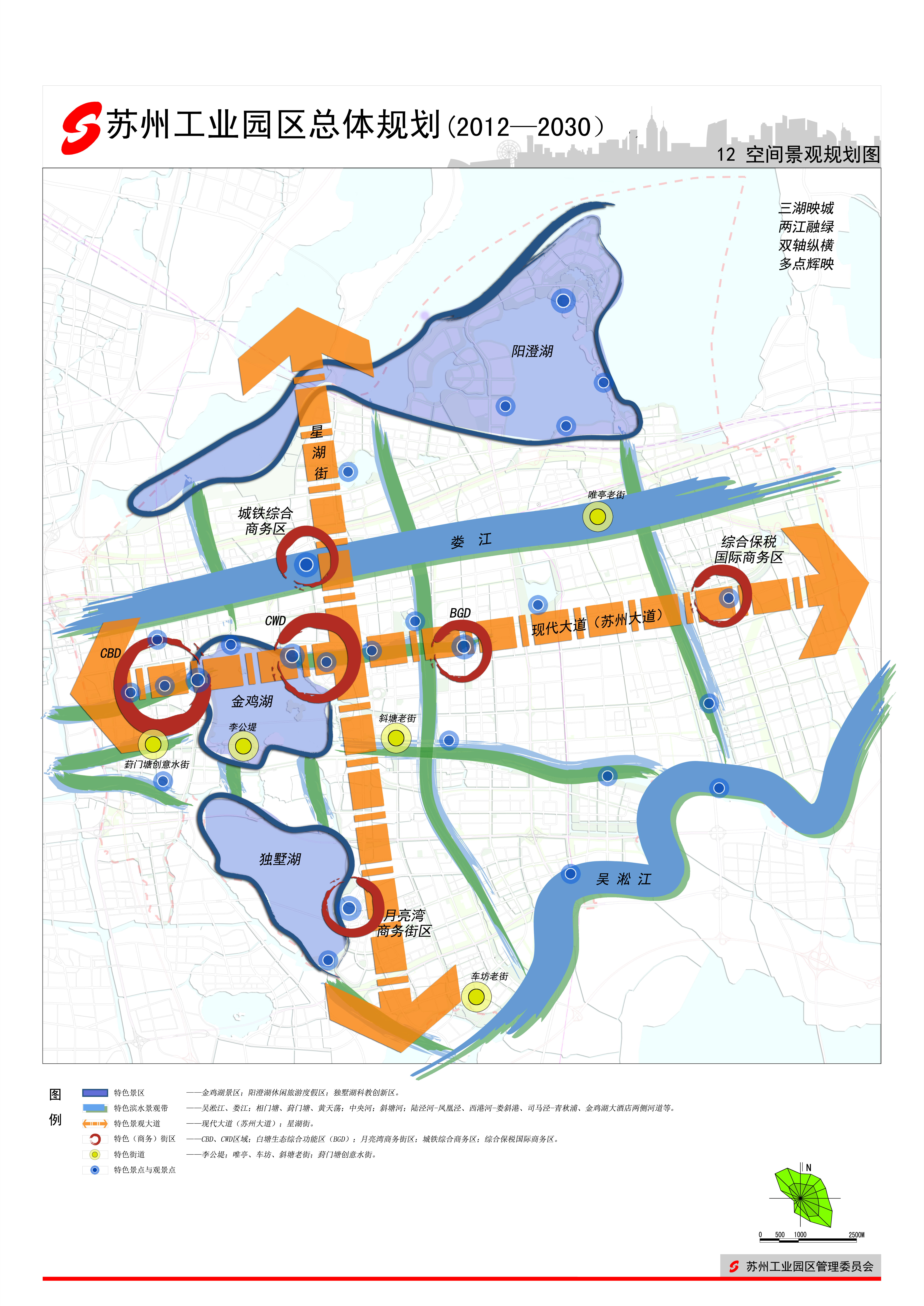 規(guī)劃形成“雙核多心十字軸、四片多區(qū)異彩呈”的空間結(jié)構(gòu)。雙核:湖西CBD、湖東CWD圍繞金雞湖合力發(fā)展,形成園區(qū)城市核心區(qū)。多心:結(jié)合城際軌道站點、城市軌道站點、功能區(qū)中心形成三副多點的中心空間。十字軸:結(jié)合各功能片區(qū)中心分布,沿東西向城市軌道線和南北向城市公交走廊,形成十字型發(fā)展軸,加強周邊地區(qū)與中心區(qū)的聯(lián)系。四片多區(qū):包括婁葑、斜塘、勝浦和唯亭街道四片,每片結(jié)合功能又劃分為若干片區(qū)。