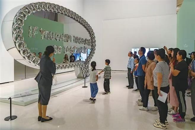 “華獅藝錦——中國(guó)·新加坡當(dāng)代藝術(shù)三十年”正在金雞湖畔的蘇州當(dāng)代美術(shù)館熱展,作品集納了兩國(guó)藝術(shù)家作品近百件。圖為昨日美術(shù)館講解員正在為觀眾講解。