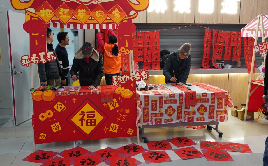 活動現場,團工委還為留蘇青年們準備了豐富多彩的暖心市集,現場歡聲笑語不斷。糖葫蘆、海棠糕、赤豆圓子……各類蘇式美食香氣四溢,投壺、套圈傳統游戲則吸引了眾多青年參與。在文化體驗區,青年們在非遺老師的指導下,親手拓印新春“福”字,學習傳統技藝,感受江南文化的獨特魅力;新年祈福墻前,大家紛紛拿起筆,在許愿牌上寫下對新一年的美好期許;而新春全家福區域則為青年們定格下了這難得的團聚時刻,留下珍貴的回憶。員工舒女士表示:“這次活動很熱鬧、很暖心,雖然沒有回家,但在蘇州也能過一個有溫度、有年味的春節。”