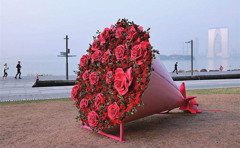 昨日,園區金雞湖北,草坪上的特大花束美麗動人,十分吸睛。