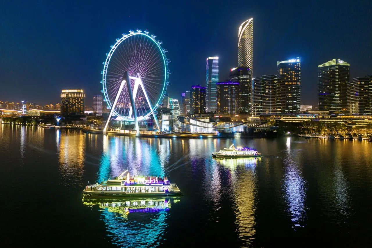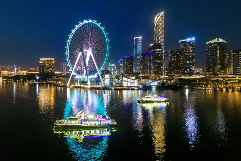 如果說“蘇州之眼”是天空的詩篇,那么右岸新航線就是水面的畫卷。夜幕降臨,“蘇州之眼”摩天輪星光閃耀,金雞湖雙體新游船霓虹流轉,水岸光影交相輝映,為園區(qū)這座現代化新城更添了幾分夢幻與浪漫色彩,令人流連忘返。