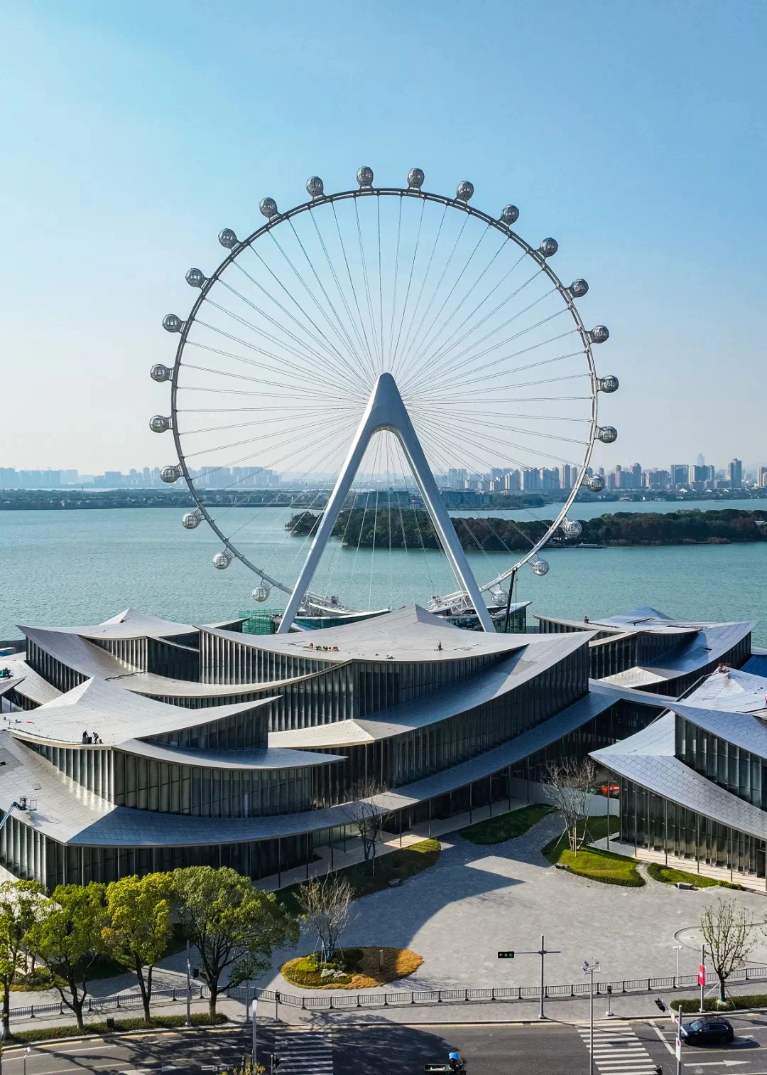 據介紹,“蘇州之眼”的設計靈感源于江南水鄉(xiāng)的柔美與蘇州園林的意境。通過異型雙立柱輪輻式結構及回轉式太空艙,既保留了傳統(tǒng)水鄉(xiāng)的婉約氣質,又以科技感造型融入現代CBD天際線。摩天輪底部建筑運用“折紙藝術”,采用折扇形屋頂及大面積落地玻璃設計,打造“濱水而居”的獨特空間體驗。