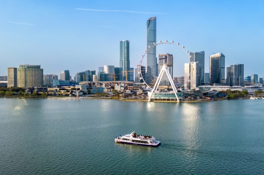 今年,伴隨著“蘇州之眼”的驚艷亮相,由新時(shí)代集團(tuán)精心打造的“金雞湖號”雙體游船與右岸新航線也華麗登場。