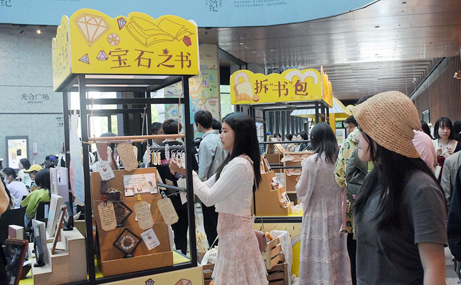 有人將“守護古籍,讓文字活起來”作為畢生的追求,也有人通過閱讀,將傳統文化之美內化為靈感乍現,開啟璀璨的創新之旅。中式飾品品牌“青沅”主理人李晴媛正是一位愛閱讀的設計師?!皩毷畷闭刮磺?,她正向市民呈現珠飾與文學交融的美學空間。“在這座文化名城、書香之城,飾品已經不僅僅是一種裝飾,更是一種文化和意境的呈現。”李晴媛表示,即便同一種寶石,因顏色、大小、搭配的不同,也能展現各具特色的韻味,而她希望自己的設計能把傳統文化之美用現代的方式傳遞出去?;顒蝇F場,她推出了命運寶石盲抽活動,愛閱之人盲抽一顆水晶石,根據顏色說出對應類型的書名,即可獲得天然水晶戒指一枚。創意的玩法引得市民游客紛紛投入與命運寶石的“雙向奔赴”。