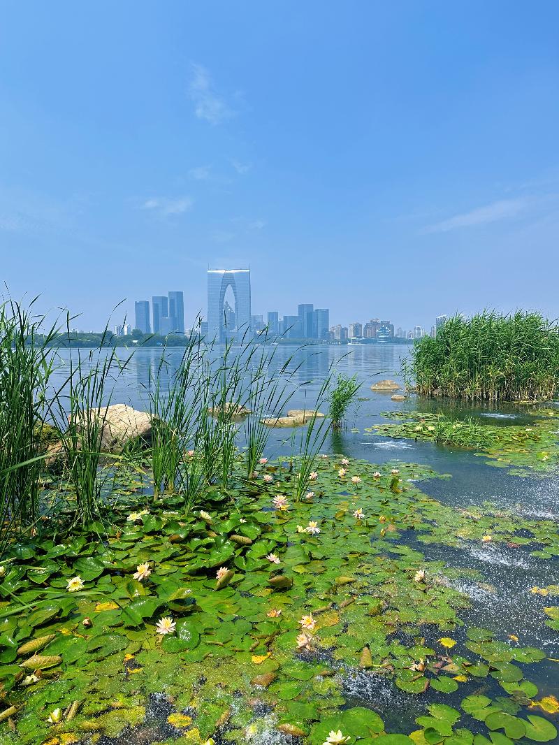 初夏時(shí)節(jié),微風(fēng)輕拂,環(huán)金雞湖步道蘇州文化藝術(shù)中心段,一朵朵睡蓮在晨光中蘇醒,正悠然綻放,將湖面裝點(diǎn)成一幅靈動(dòng)的生態(tài)畫卷。