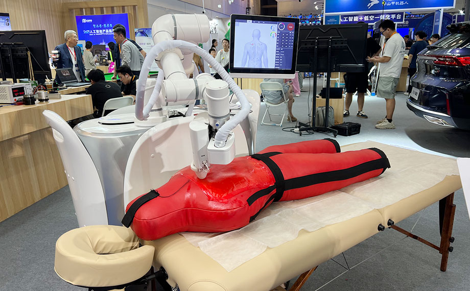 安韋澤是新加坡科技研究局的首個海外分支機構(gòu)——新科研引入園區(qū)的一家科技企業(yè),此次展會帶來按摩機器人EMMA,將千年中醫(yī)經(jīng)絡(luò)理論與前沿機器人技術(shù)相融合,重新書寫“推拿”技藝的時代傳承。“EMMA集3D視覺及多種高精度傳感器與一體,可以實時生成人體三維數(shù)據(jù)圖、感知人體背部的肌肉緊張度;同時采用仿生設(shè)計和柔性力控,結(jié)合實時壓力反饋系統(tǒng),能夠精準(zhǔn)按摩,動態(tài)調(diào)整力度與節(jié)奏。”安韋澤項目工程師陳雪介紹,EMMA每一次服務(wù)都會生成報告,為后續(xù)服務(wù)提供指導(dǎo)和參考,形成個性化理療方案。“目前,我們在園區(qū)已落地研發(fā)和生產(chǎn),相關(guān)產(chǎn)品在中醫(yī)診所、康復(fù)機構(gòu)已有應(yīng)用,正在申請國家醫(yī)療器械注冊流程,未來將讓優(yōu)質(zhì)康復(fù)資源惠及更多人群。”