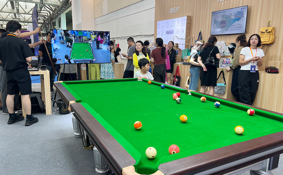 在臺球直播區,前央視金牌解說劉建宏正在做智能臺球直播演示。只見臺球開球后,視頻畫面鏡頭自動切換、比賽數據同步收集呈現。