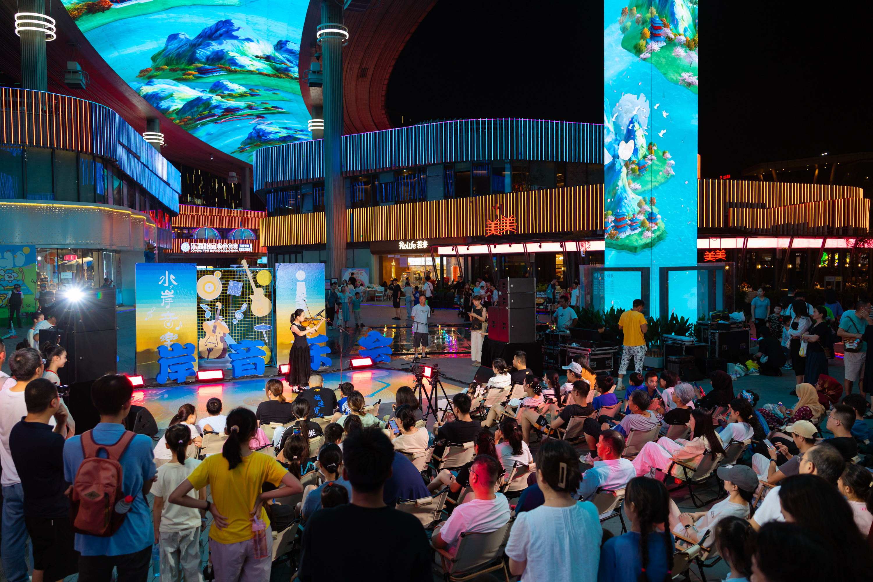 在圓融時代廣場天幕街東街沿岸,為期八天的“水岸音樂會”為假日增添了輕松閑適的底色。夜幕降臨,華燈初上,民謠歌手的淺吟低唱與流行樂隊的歡快節奏,伴著微涼的晚風飄散開來。觀眾們或手捧咖啡,或拿著冰淇淋,隨意地席地而坐,孩子們則隨著音樂節奏輕輕搖擺。