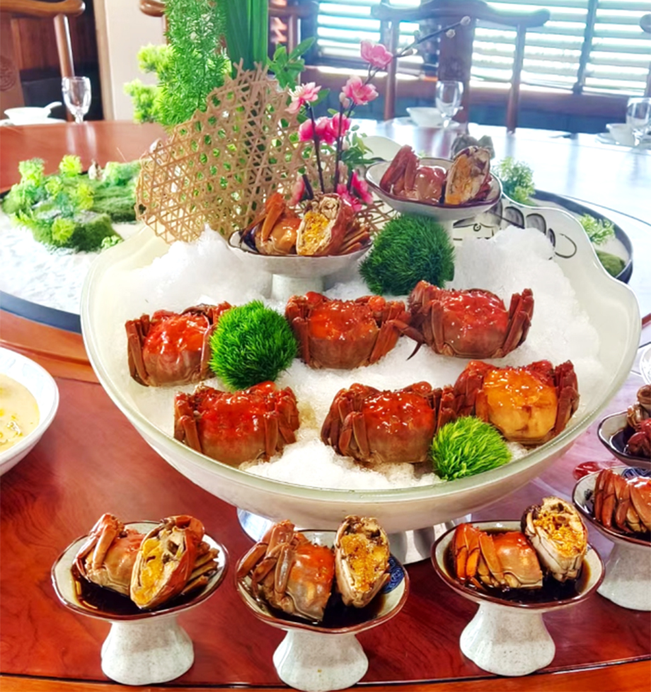 若要票選江南人最貪戀的味道,冰鎮花雕熟醉蟹絕對是的“頂流”。這道菜要選用最肥美的陽澄湖大閘蟹,在蒸到殼紅肉嫩時,浸入用六年陳花雕和秘制香料調得透亮的醉鹵——酒香像溫柔的手,慢慢揉開蟹肉的鮮;蟹黃吸飽了酒意,咬開是流油的綿密;蟹肉更絕,緊致里帶著清甜,每一口都是“鮮得眉毛掉”的江南本味。這道菜看著簡單,卻是廚師把陽澄湖的晚霞和秋風,釀進了所有江南饕客的心底。