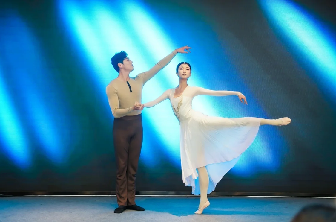 現(xiàn)場(chǎng),蘇州芭蕾舞團(tuán)以柔美與力量交融的《鵲橋》片段拉開(kāi)帷幕,藍(lán)調(diào)追光下,舞者裙擺劃出透亮弧線(xiàn),仿佛將江南水韻融入足尖芭蕾的韻律之中。