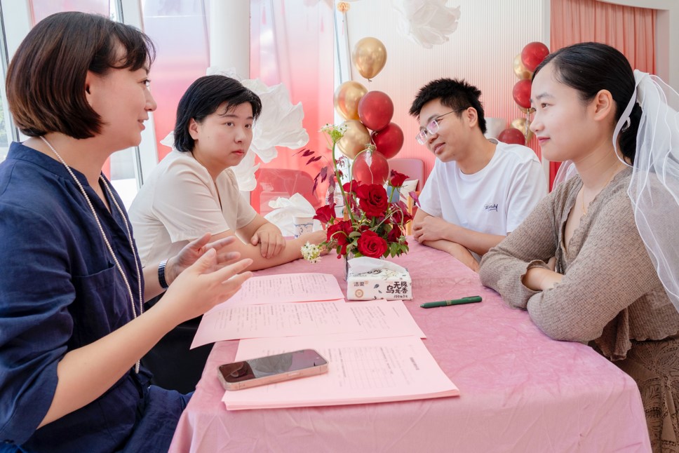 園區兩處婚姻登記載體通過設置各具特色的互動攤位,創新婚姻登記服務,融入充滿文化內涵和情感溫度的幸福體驗項目,為新人朋友們的七夕紀念日記錄具有特別意義的甜蜜時刻?!拔覀冊O計了三個互動活動,希望新人們在園區婚姻登記處完成新婚登記之后,開啟甜甜蜜蜜的新生活?!痹堈f道。