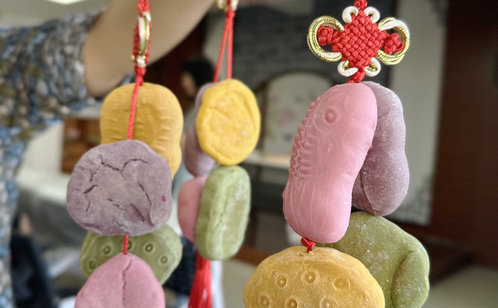 待巧果微涼,穿串環(huán)節(jié)更添趣味。看那形態(tài)各異的巧果:“金魚(yú)”躍然其上,寄寓年年有余;“葫蘆”飽滿(mǎn)圓潤(rùn),象征福祿雙全;“寶扇”輕盈舒展,預(yù)示生活美滿(mǎn);“蓮蓬”諧音“連子”,寓意子孫滿(mǎn)堂。居民們?nèi)?lái)紅繩,將寓意美好的巧果細(xì)心穿成串。長(zhǎng)輩們把巧果串遞到孩子手中,盼著孩子們聰慧靈巧、健康成長(zhǎng);鄰里間互相贈(zèng)送,紅繩牽著巧果,也牽著彼此的心意,讓節(jié)日的喜悅與“闔家安康”的祈愿,隨這串甜蜜悄悄傳遞。