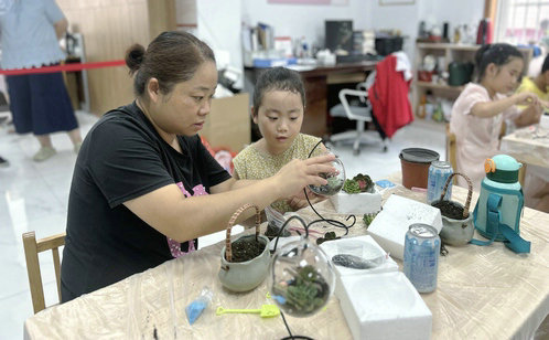 “綠趣微世界 多肉睦鄰情”活動現(xiàn)場洋溢著童趣與創(chuàng)造力。孩子們在家長的陪伴下,將一株株形態(tài)可愛的多肉植物植入盆中,搭配彩石、玩偶,打造出各具特色的“微景觀”,家長與孩子共同商量、協(xié)作完成,現(xiàn)場的交流聲、歡笑聲此起彼伏。此次活動不僅增進(jìn)了親子情感,培養(yǎng)了孩子的動手能力與創(chuàng)造力,還促進(jìn)了鄰里之間的交流與了解。
