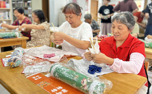 活動室內(nèi),清雅的艾草香氣悠然彌漫。二十多位長者圍坐桌旁,在“紅管”志愿者的指導(dǎo)下專注地制作艾草養(yǎng)生錘和安神枕。填艾、裹布、纏線、收口,一道道工序考驗(yàn)著手上功夫,更喚醒了老人們深藏的記憶。大家一邊忙碌,一邊自然聊起家常里短、季節(jié)養(yǎng)生和往昔歲月。