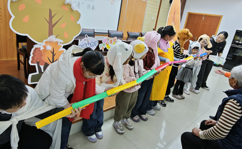 活動在冬至小劇場《冬爺爺的禮物》中溫馨啟幕。在“紅色管家”志愿者的帶領下,孩子們扮演成劇中活潑的小動物,與“冬爺爺”一同探尋冬至的故事。通過生動的情景對話與角色互動,孩子們不僅了解冬至的天文意義與文化寓意,也體會到南北飲食習俗的差異。劇中穿插“數九歌”等民俗元素,讓節氣知識顯親切生動。隨后開展的“運湯圓”團隊游戲,讓孩子們在協作傳遞中感受分享與合作的快樂。這場劇場體驗,不是觀看與聆聽,更是親身參與情感共鳴,在歡聲笑語中悄然播下文化傳承的種子。
