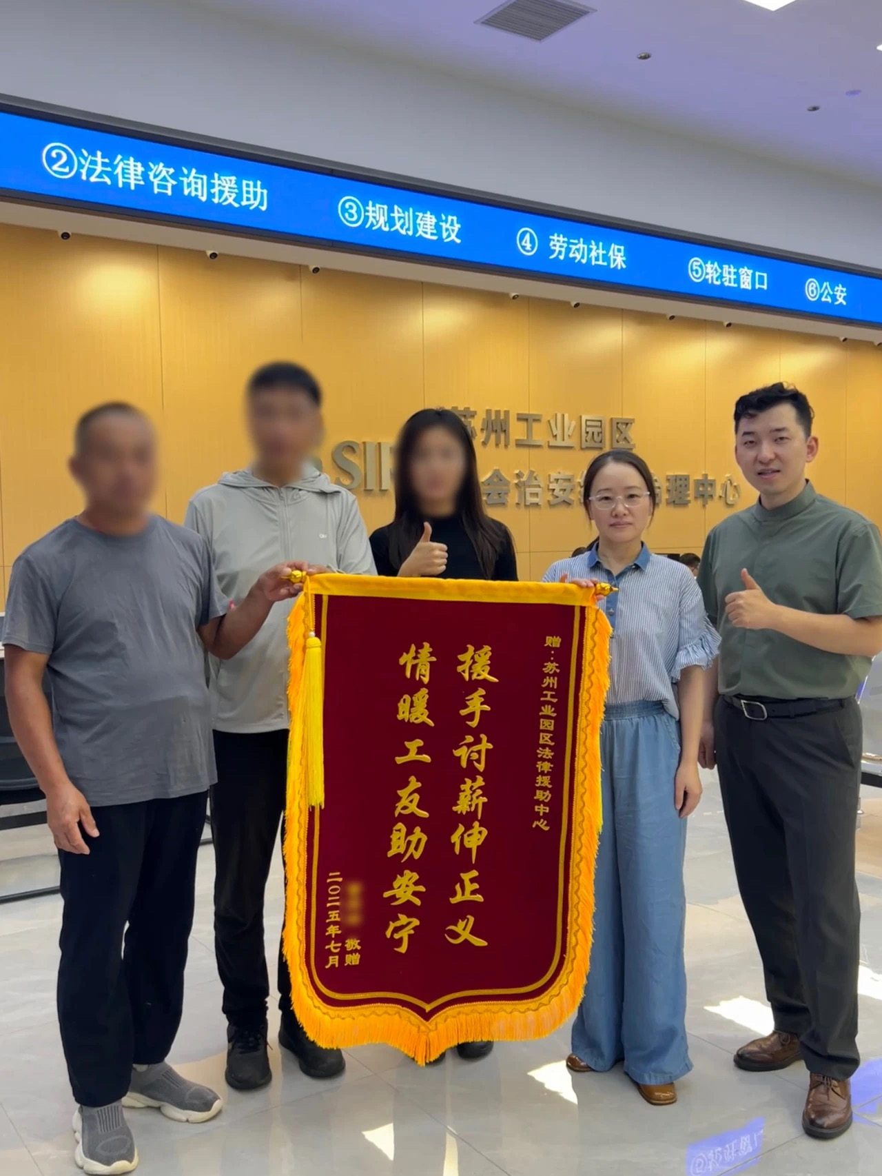 園區法律援助中心當天即指派專業律師團隊介入。考慮到受援人普遍年事已高、行動不便,承辦律師主動上門服務,逐人梳理證據材料、核算欠薪金額,并協助推選訴訟代表人。同時,園區法律援助中心將案件線索移送檢察院,啟動民事支持起訴程序,并聯合信訪、人社、規建等部門開展調解工作。經過多方共同努力,7月20日,用工單位全額支付23萬元欠薪,52名老人都當場領到了被拖欠的勞務費。事后,工人代表及家屬專程向園區法律援助中心贈送錦旗表達謝意。