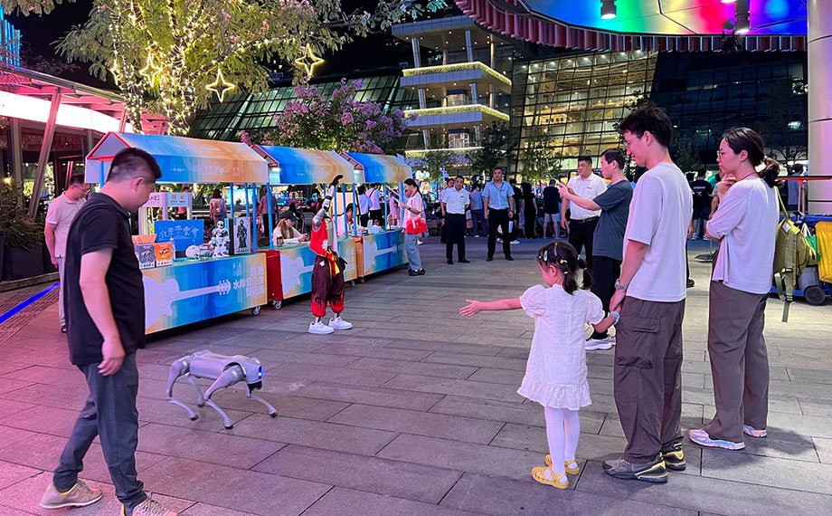 天幕下,變幻著燈光的地面噴泉讓愛玩水的萌娃樂此不疲,而臨近的水岸音樂會甄選市集上,哪吒造型的機器人、身姿靈活的機器狗也與大家握握手、跳個舞熱情互動,讓往來的大朋友、小朋友心動不已?!八兑魳窌e聚人氣,實現(xiàn)了很好的引流,不僅提升了市民的生活質感,也為我們企業(yè)推廣搭建了全新的場景。機器人正當熱點,我們與圓融合作,在圓融天幕和月光碼頭都設置了展臺,提供機器人的表演、互動,以及配套小機器人的售賣,對于展示企業(yè)形象、能力,展現(xiàn)園區(qū)高科技活力,都是很好的平臺?!卑朔綑C器人經(jīng)理朱錦介紹說。