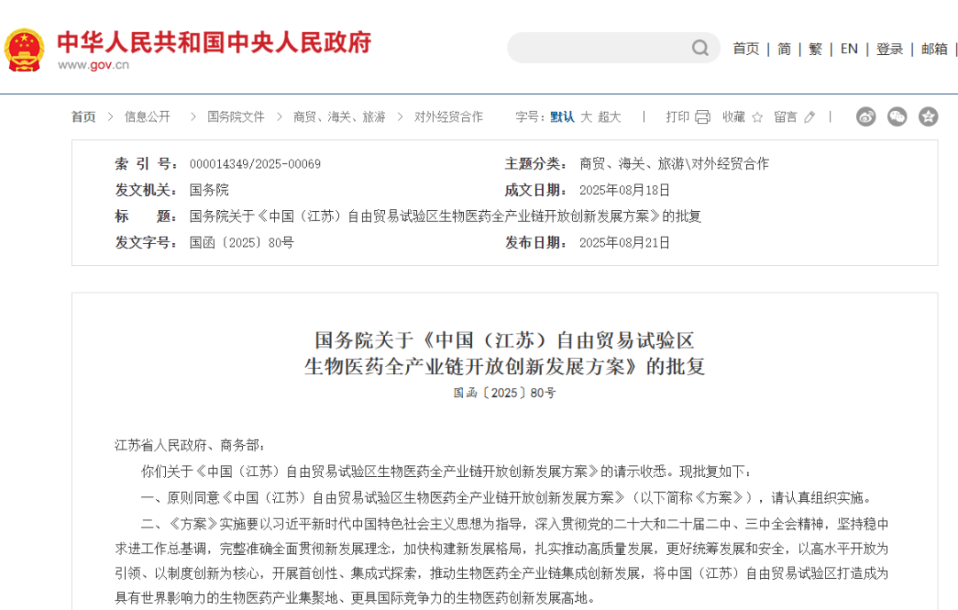 8月18日,獲批即將滿6年的江蘇自貿試驗區再度迎來重大政策利好,國務院批復原則同意《中國(江蘇)自由貿易試驗區生物醫藥全產業鏈開放創新發展方案》,高水平開放平臺“碰撞”千億級重磅產業,生物醫藥產業競爭力躍升的新路徑正逐漸清晰。