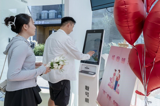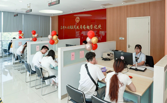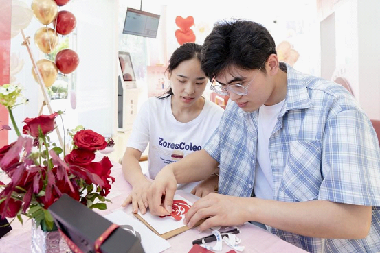 At the marriage registration office at Suhongxi Road, young couples had the chance to make a sachet for their spouse as a token of love. They could also write down their wishes on paper, seal it with a special stamp and put it in a customized photo frame.