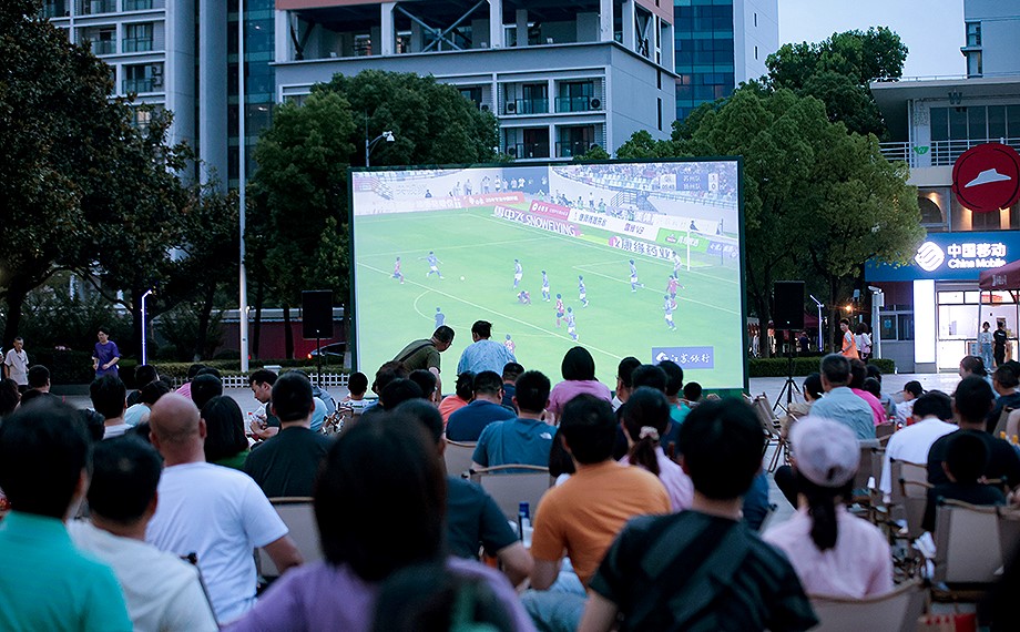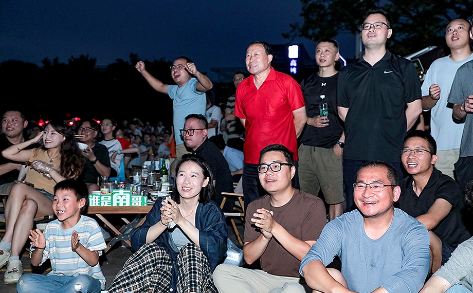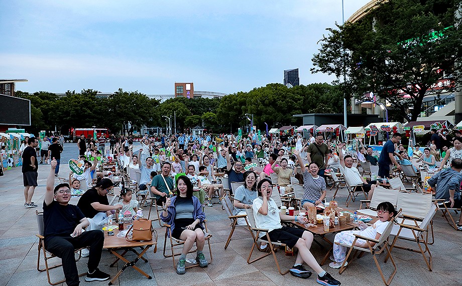 On June 29, many people watched the football match between the Suzhou Team and the Yangzhou Team on the huge screen at Wenxing Square, while enjoying delicious snacks they bought from the surrounding stalls.