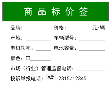 二、明碼標(biāo)價(jià),放心消費(fèi)。經(jīng)營(yíng)者應(yīng)當(dāng)以顯著方式進(jìn)行明碼標(biāo)價(jià),做到價(jià)簽價(jià)目齊全,標(biāo)價(jià)內(nèi)容真實(shí)準(zhǔn)確。價(jià)格標(biāo)簽或價(jià)目表等應(yīng)包括品牌價(jià)格、車(chē)輛型號(hào)、計(jì)價(jià)單位、產(chǎn)地、顏色、電機(jī)功率、投訴舉報(bào)電話等信息。價(jià)格標(biāo)簽和價(jià)目表推薦格式附后,供參考使用。