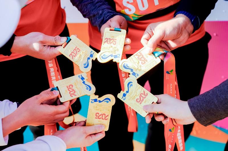 值得一提的是,本次賽事獎牌為全新設計定制,競速跑獎牌上有環湖棧道、水澤驛站圖案;接力跑獎牌則將半島樂跑元素、特色水域、地標建筑相融合,6塊獎牌拼接時將呈現出一個整體的鏤空六芒星圖案,彰顯半島藝術特色,體現出“半島?企業?家”的融合共進。