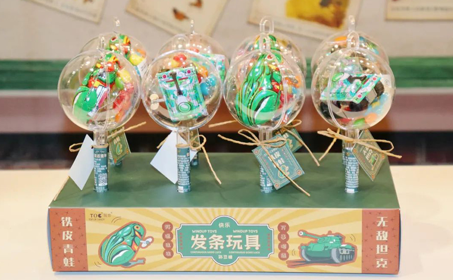除了館藏上萬件玩具之外,蘇玩博還特別推出文創產品。鐵皮青蛙樣式的發條玩具彩豆糖首次亮相,玩玩具+吃糖果一次性滿足。陽澄湖大閘蟹玩偶萌趣十足,你還可以手動遙控玩偶,聽大閘蟹讀古詩或講故事。