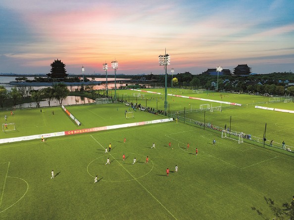 湖畔的足球公園正孕育著半島即將到來的又一輪熱力。4個標準足球場正在有序進行著草坪的修剪和養護。“你看草坪上的孔是剛打的,一個星期左右,新的草就會長好了。”球場保障部負責人何旭澤說,這些經過FIFA認證的球場,是長三角地區足球愛好者的“心頭好”,“周末的時候,經常有上海、浙江的足球愛好者預約過來踢球。你看這片場地,即便是雨天,也不會出現積水的情況,比一些職業俱樂部的球場都好。”
